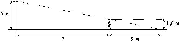 На каком расстоянии (в метрах) от фонаря стоит человек ростом 1,8 м, если длина его тени равна 9 м, высота фонаря 5 м?