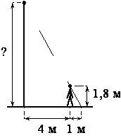 Человек, рост которого равен 1,8 м, стоит на расстоянии 4 м от уличного фонаря. При этом длина тени человека равна 1 м. Определите высоту фонаря (в метрах).